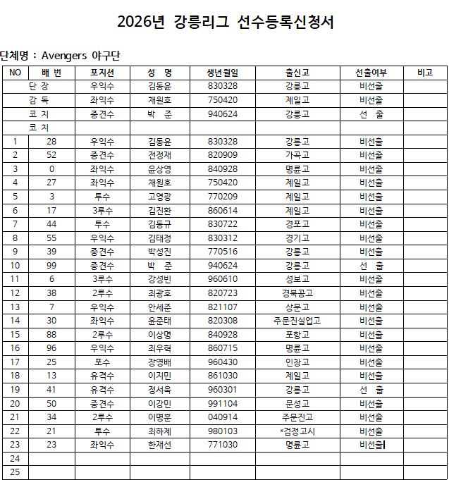 26년 어벤져스 최초선수명단
